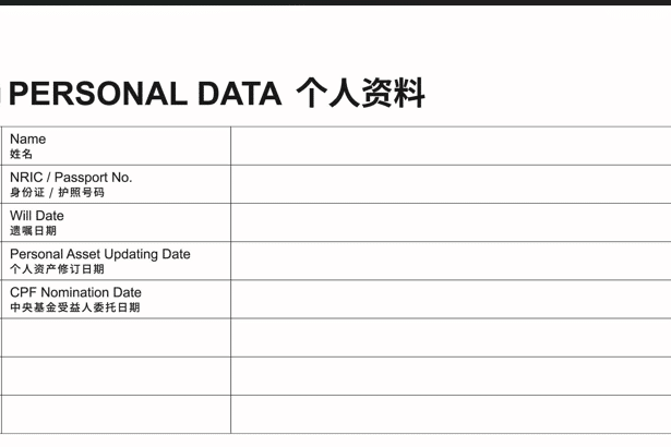 许多人在第一次填写 Assets Information Booklet 时,常误以为“只要写出主要资产就够了”。但真正完善的记录,必须包括所有财务细节与文件位置,才能发挥完整效用。Smartwills 建议,在填写时应全面梳理自己名下的资产结构,从银行账户、保险、房产到股票投资、退休基金及贷款记录都不应遗漏。